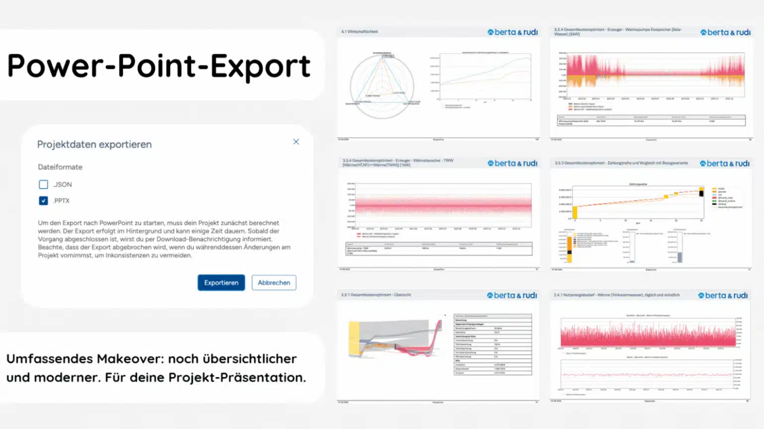 Im Fokus stehen dabei die Vereinheitlichung der Größenordnungen bei Energiesystemen als auch die Aktualisierung der Energiepreise. Außerdem kannst du dich auf ein umfangreiches Performance-Update der Benutzeroberfläche freuen und unser PowerPoint-Export hat ein umfassendes Makeover erhalten.