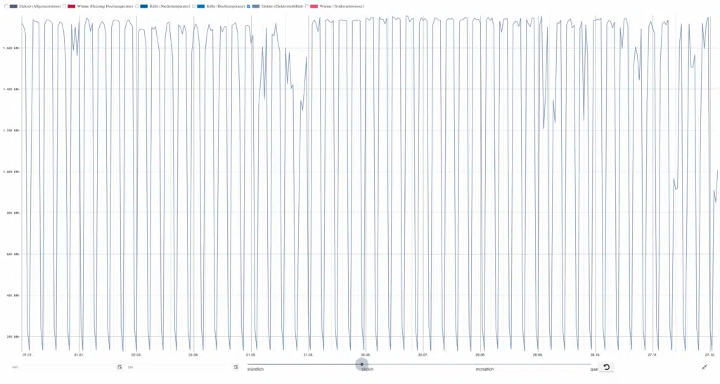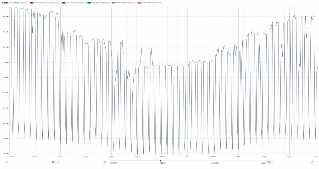 - Reduktion ab 17 Uhr, Grundlast durch Server, Sicherheitsbeleuchtung, Kühlbedarf im Sommer