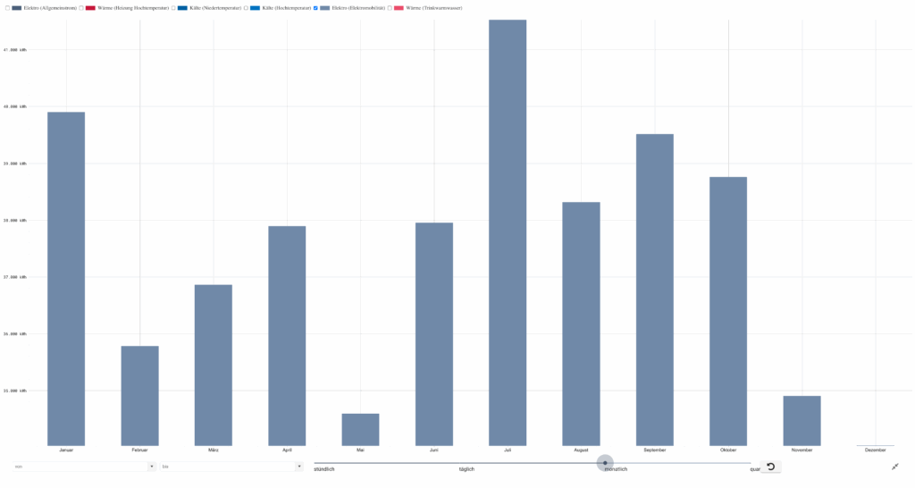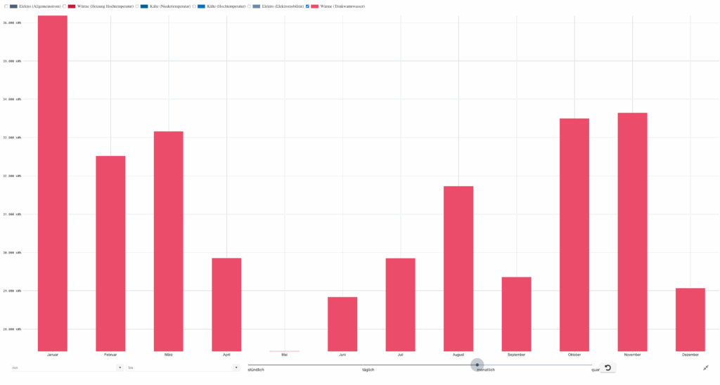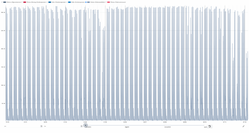 Ein klarer Tagesgang: morgens ansteigend, Hauptverbrauch tagsüber, starker Rückgang ab dem späten Nachmittag. Am Wochenende nur Grundlast.