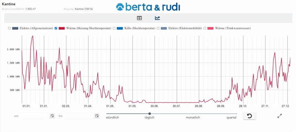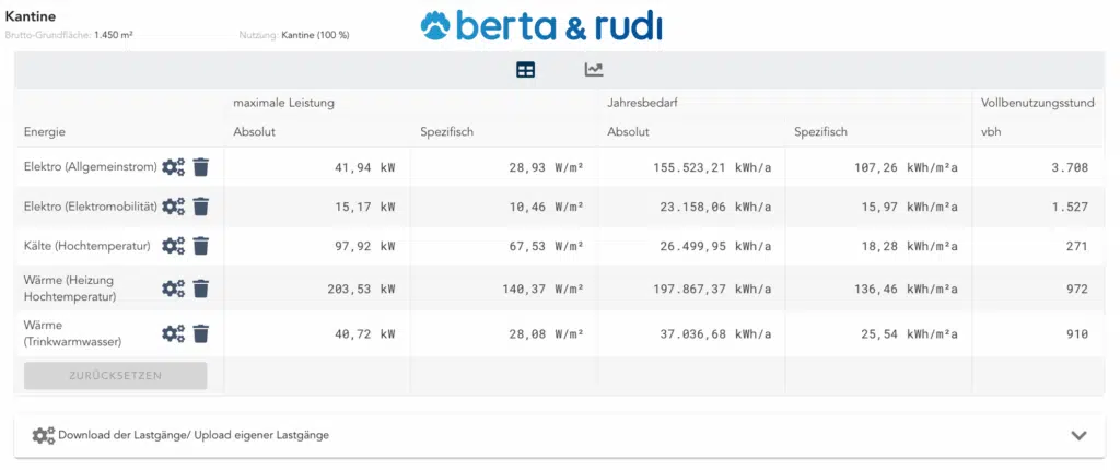 Kantinen gehören zu den intensiv genutzten Nichtwohngebäuden mit stark nutzungsabhängigen Energiebedarfen – insbesondere an Werktagen rund um die Mittagszeit. Der Energieverbrauch folgt dabei klaren Lastspitzen in Küche, Speisesaal und Nebenbereichen. In diesem Beitrag findest du das typische Lastprofil einer Kantine, aufgeschlüsselt nach den Gewerken Raumwärme, Raumklimatisierung, Trinkwarmwasser, Allgemein- und Nutzerstrom sowie Elektromobilität. Für Kantinen stehen spezifische Lastprofile zur Verfügung, die sowohl stündlich als auch in täglicher, monatlicher und quartalsweiser Auflösung visualisiert sind. So erhalten Energieexperten eine fundierte Grundlage für eigene Berechnungen oder Simulationen – mit berta & rudi.