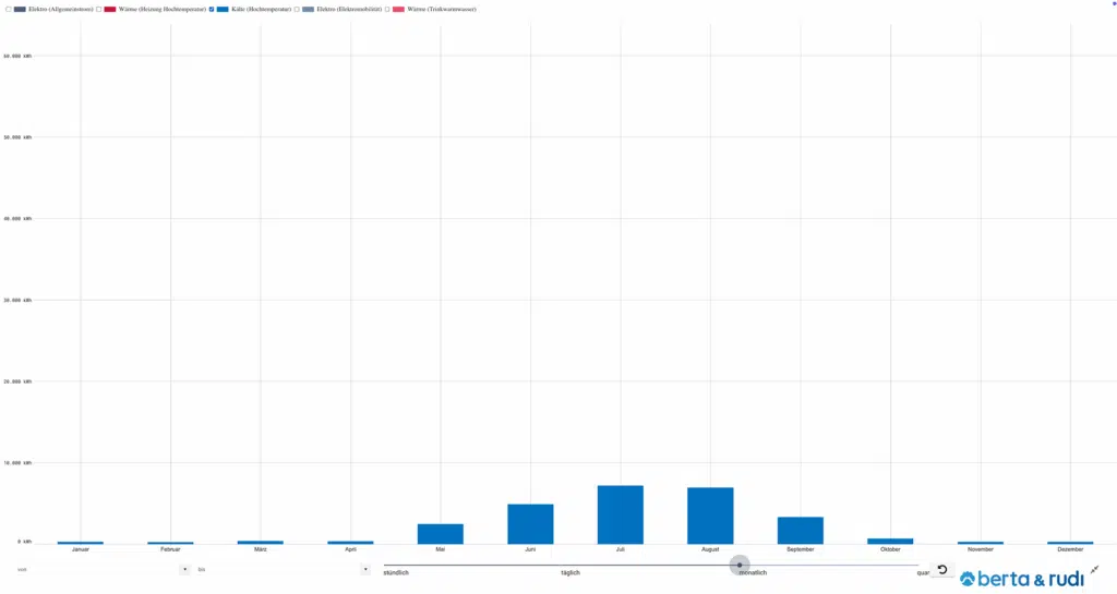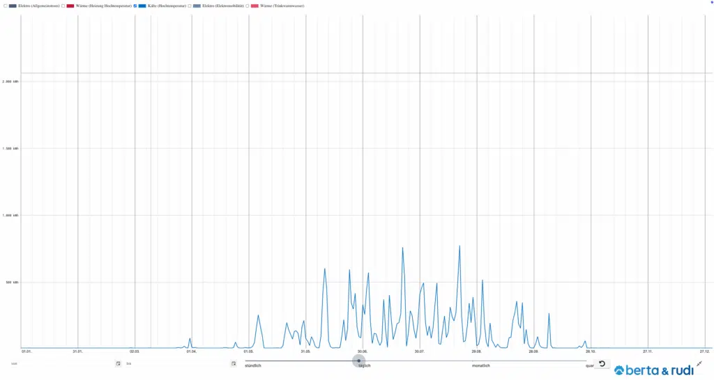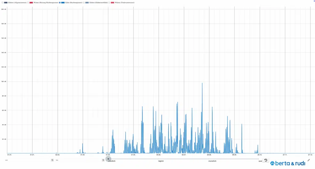 - Kältebedarf im Sommer deutlich erhöht, Spitzen mittags (10:30–14:00 Uhr)