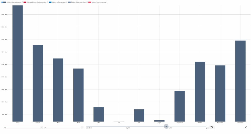 Stark tages- und werktagsbezogen, mit deutlichem Peak am Vormittag und sehr geringem Verbrauch am Nachmittag, Abend und Wochenende.
